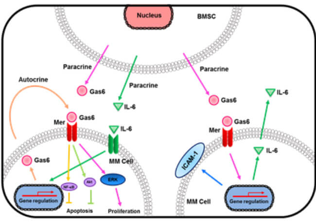 多発性骨髄腫は多彩な単クローン性免疫グロブリン(M蛋白)および骨髄腫細胞と骨髄の間質細胞の細胞間相互作用によって産生されるサイトカインなどの液性因子によって多彩な臨床症状を呈する疾患であり、その病態には未だ多くの不明点があります。プロテインCの補因子として知られるGas蛋白群の一員であるGas6(growth arrest-specific 6)は受容体型チロシンキナーゼ(Tyro3, Axl, Mer)のレガンドであり、自己免疫疾患や炎症病態への関与が報告されています(Cell. 54:787-793, 1988 PLos One. 10:e0133940, 2015 J Cell Physiol. 204:36-41, 2005)。
