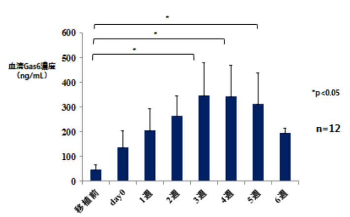 - 同種移植後の患者血清のGas6濃度は移植後3-5週をピークに増加していた。